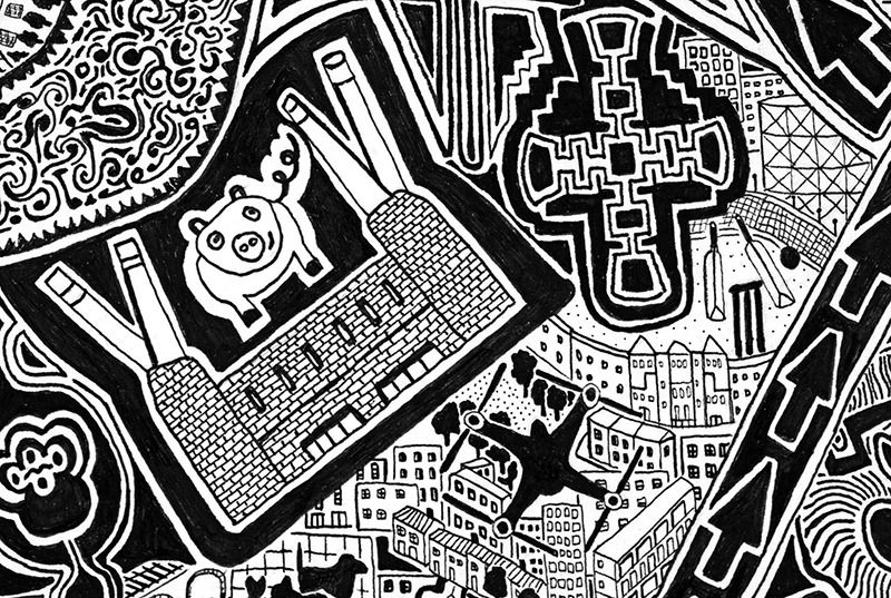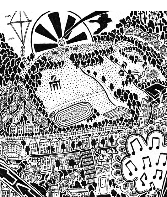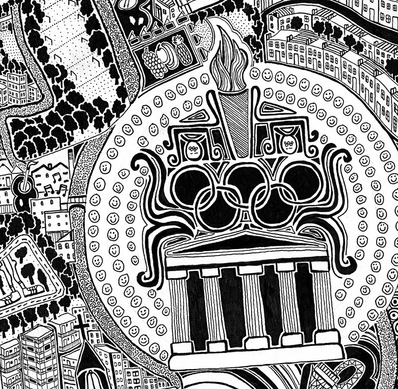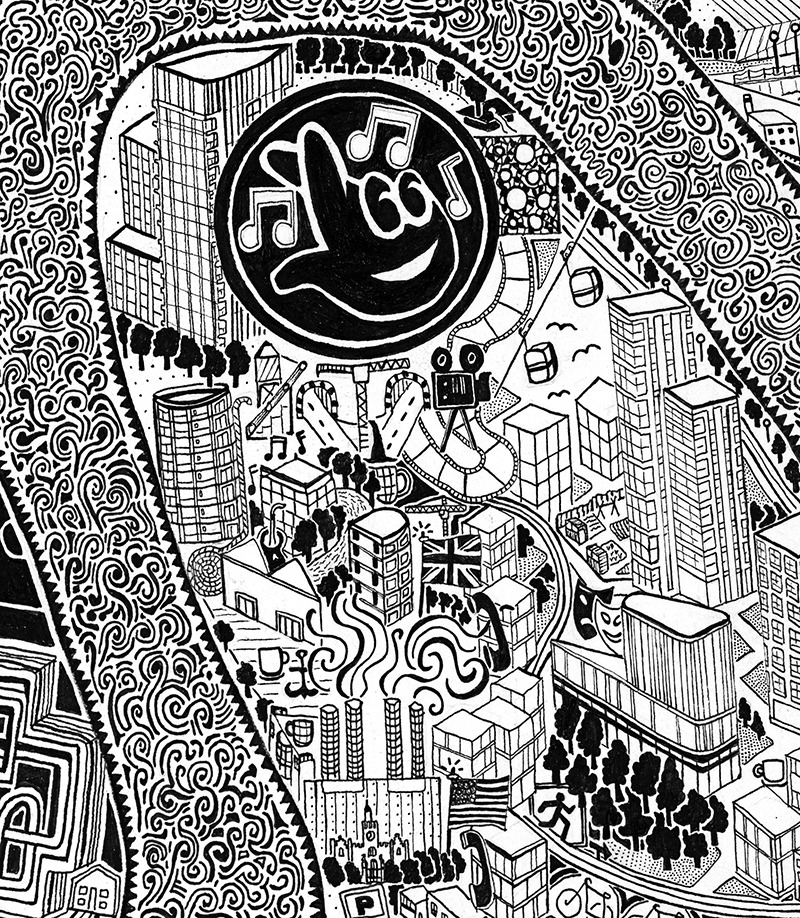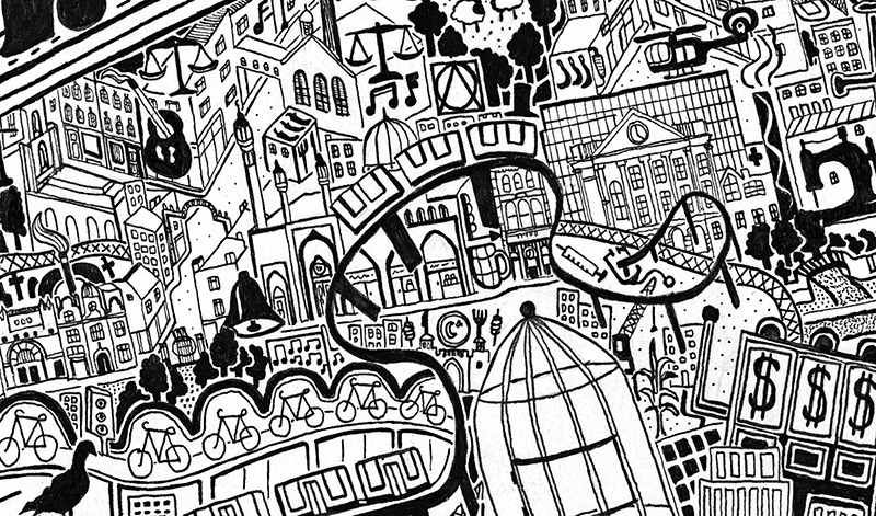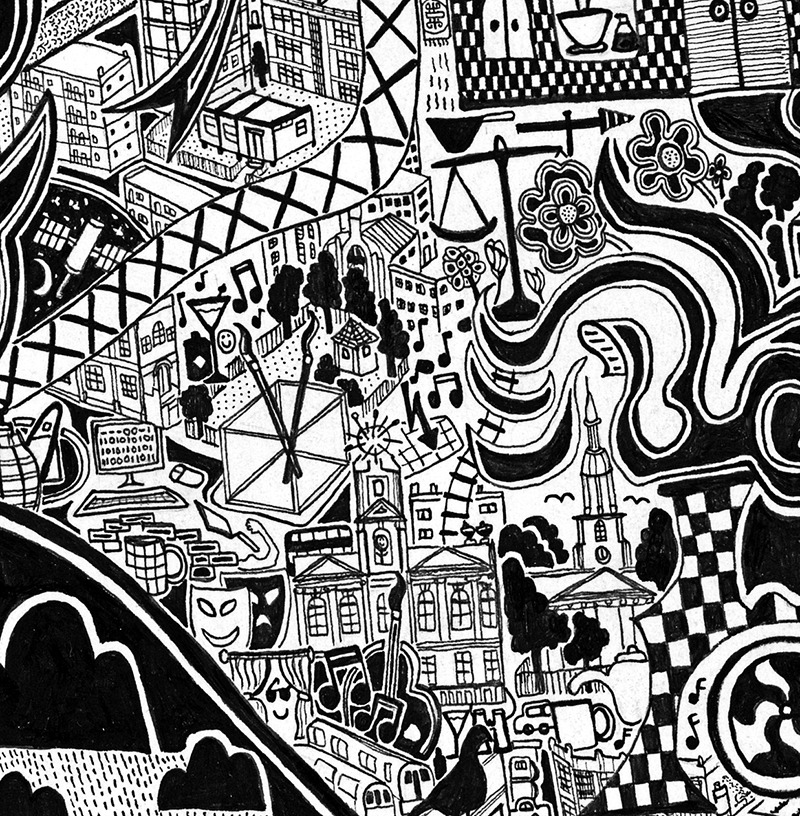 Les rues, bâtiments et lieux touristiques principaux sont bien entendu présents mais on y trouve également des endroits moins connus et plus subjectifs, qui lui sont personnellement chers ou encore certaines représentations symboliques d’évènements historiques en lien avec la ville.