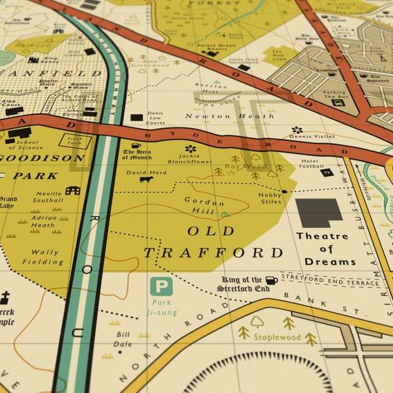 Cette carte nous emmène à la découverte d’une ville imaginaire composée des noms de plus de 500 personnes emblématiques du monde du ballon rond anglais et des lieux mythiques associés au football. Elle intègre des références à tous les clubs de la Premier League et de Premiership écossaise ainsi que quelques clubs des divisions inférieures. Que vous souteniez Arsenal ou Accrington Stanley, il devrait y avoir de quoi satisfaire tous les afficionados du football anglais !