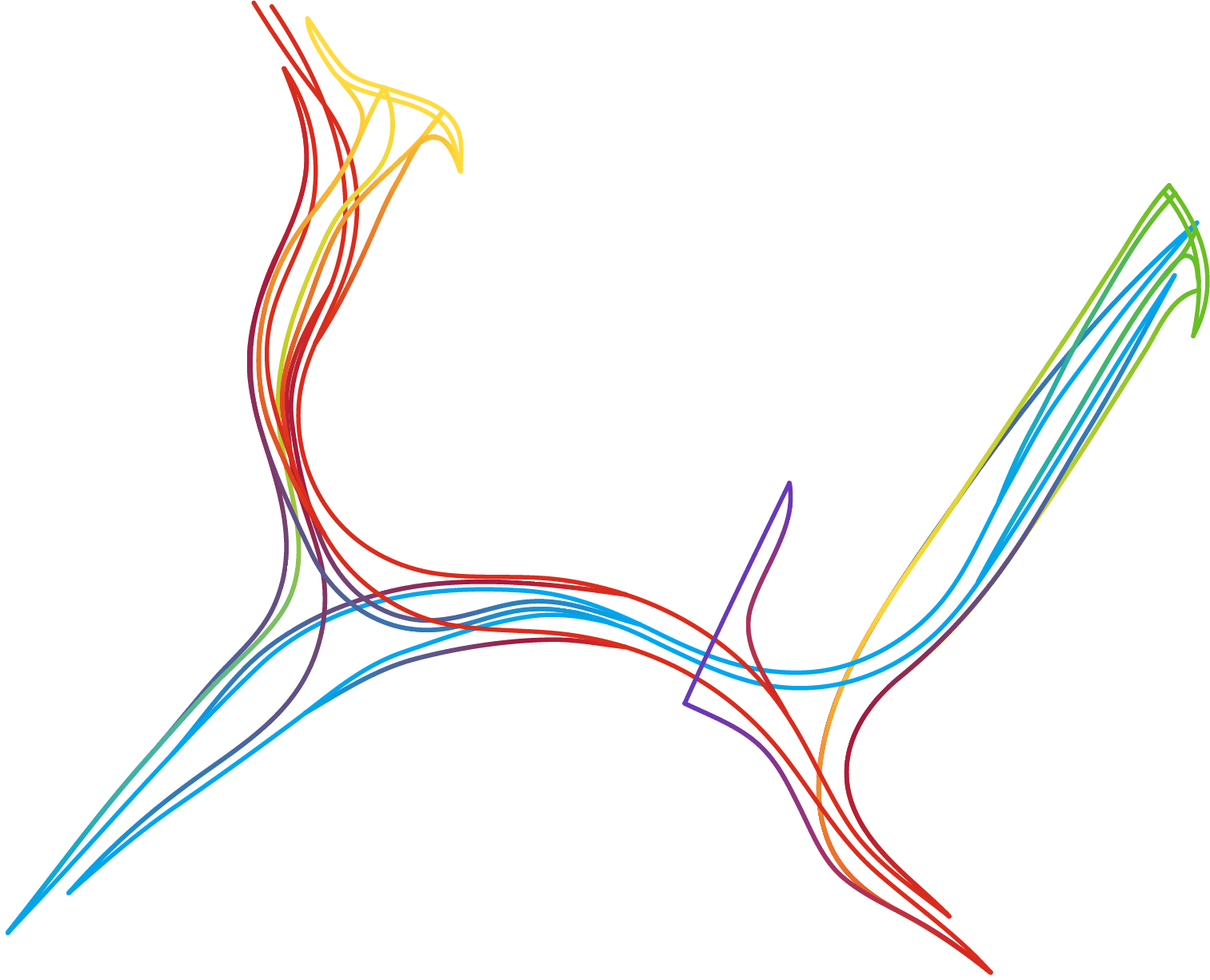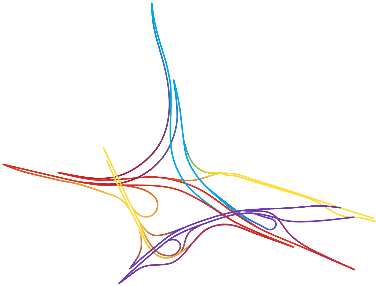 Le projet « interchange choregraphy » est une collection d’échangeurs complexes comprenant trois voies ou plus. Des centaines d’échangeurs autoroutiers dans le monde ne comprennent bien entendu que deux voies et sont au moins aussi complexes que ceux ici présents. Cependant ils n’ont pas été retenus car les possibilités graphiques au niveau de l’assemblage des couleurs sont beaucoup moins étendues. Chacune des lignes des cartographies a d’ailleurs été colorisée à la main et non par l’intermédiaire d’un code ou autre automatisation.