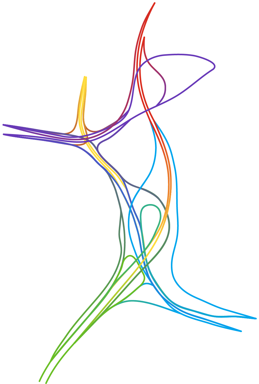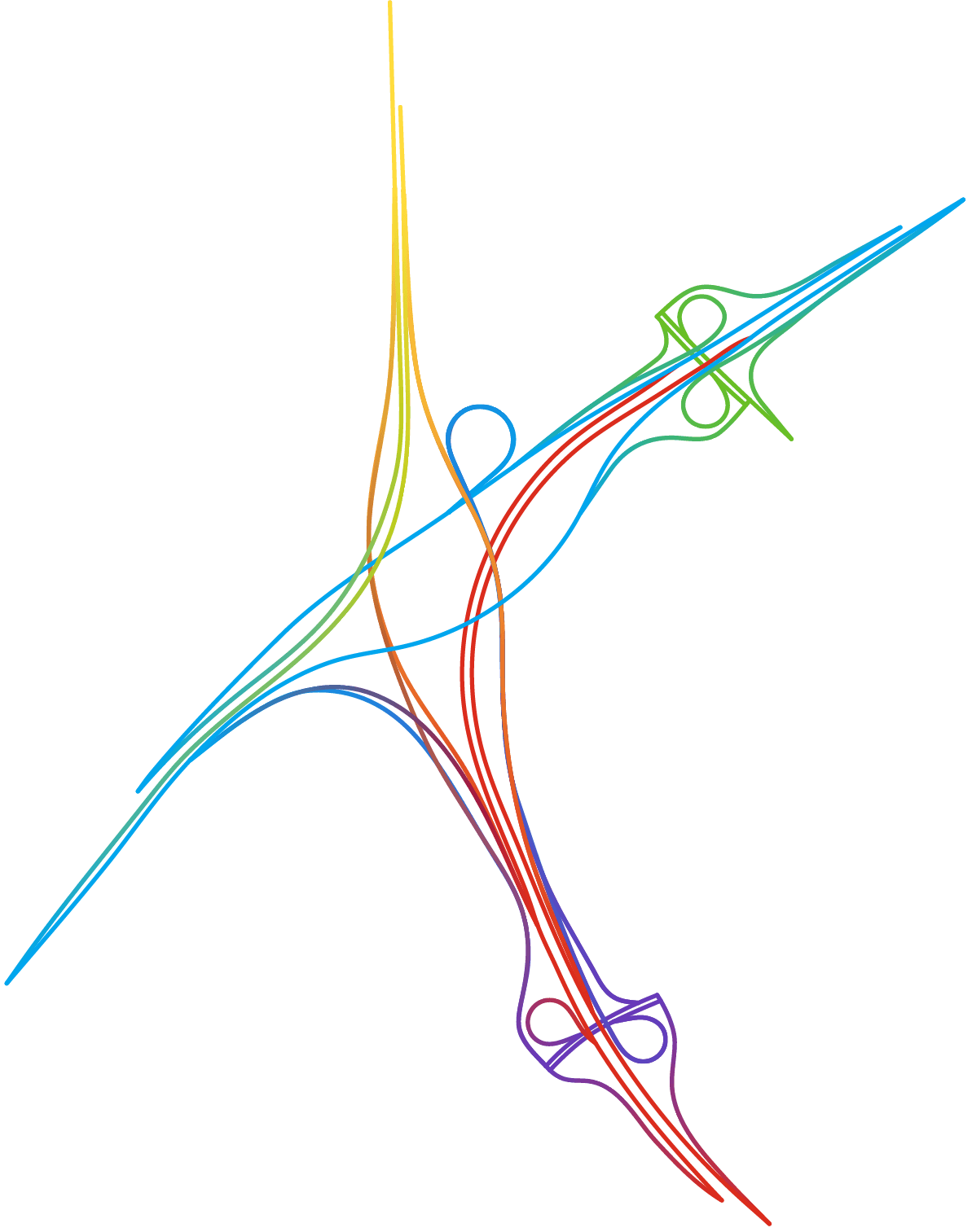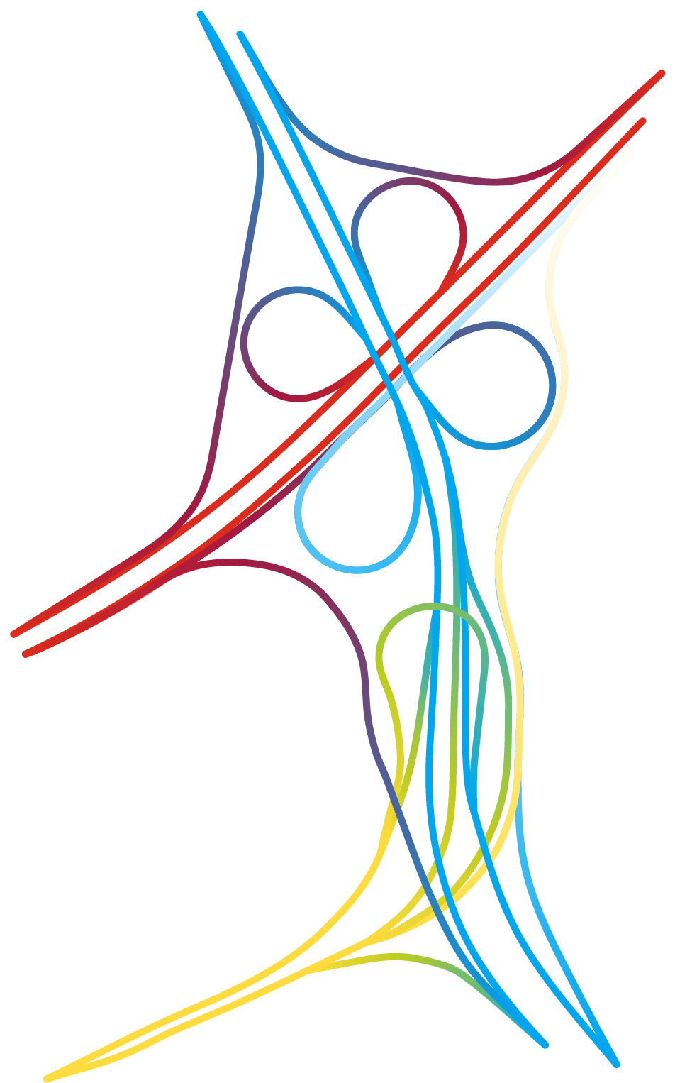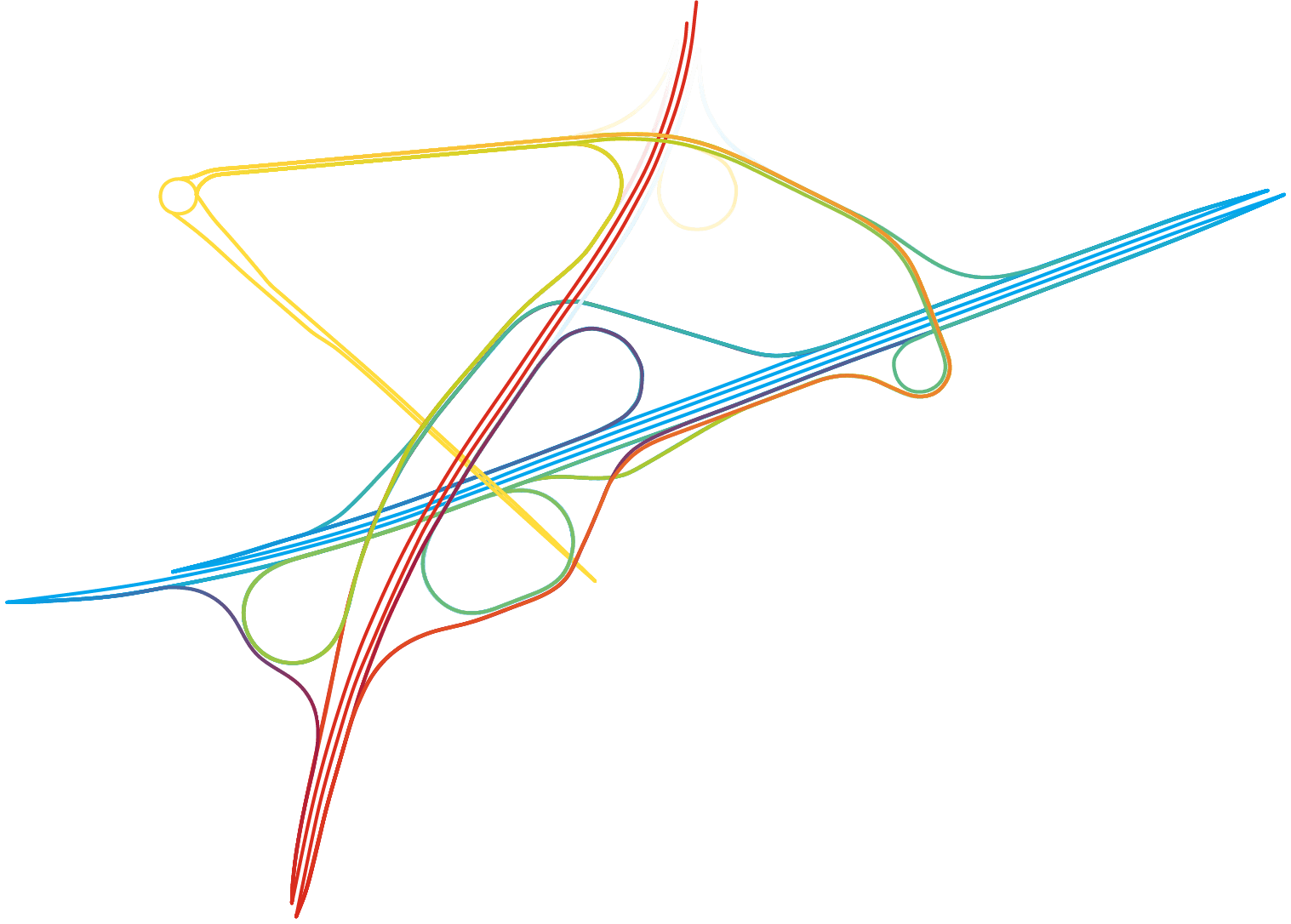Partout dans le monde les échangeurs autoroutiers se sont vus affublés d’étranges surnoms tels que « bretelles », « nœuds » ou encore « carrefours spaghettis » (« spaghettis junctions » en anglais) évoquant fortement, et à juste titre, un désordre enchevêtré. Le cartographe – graphiste Nicholas Rougeux nous prouve avec brio qu’il est toujours possible de trouver de la beauté dans le chaos.