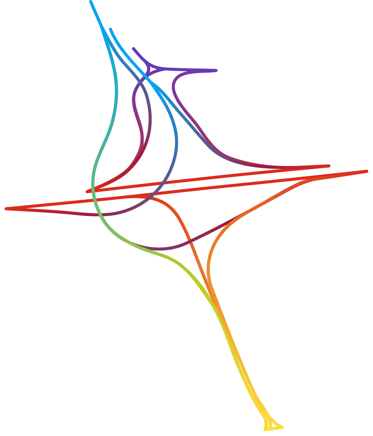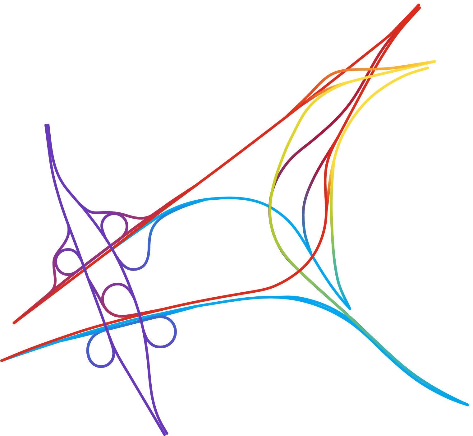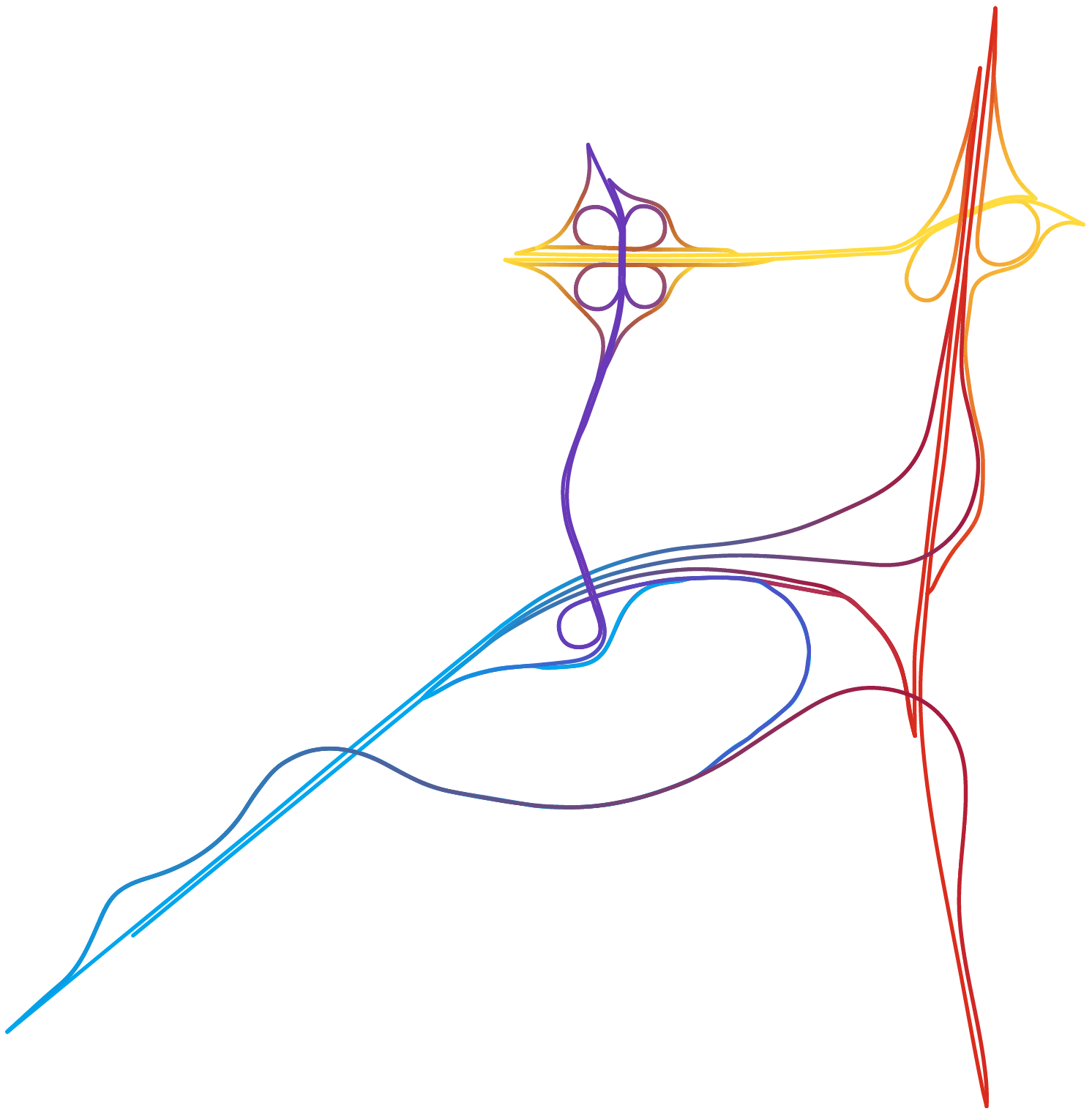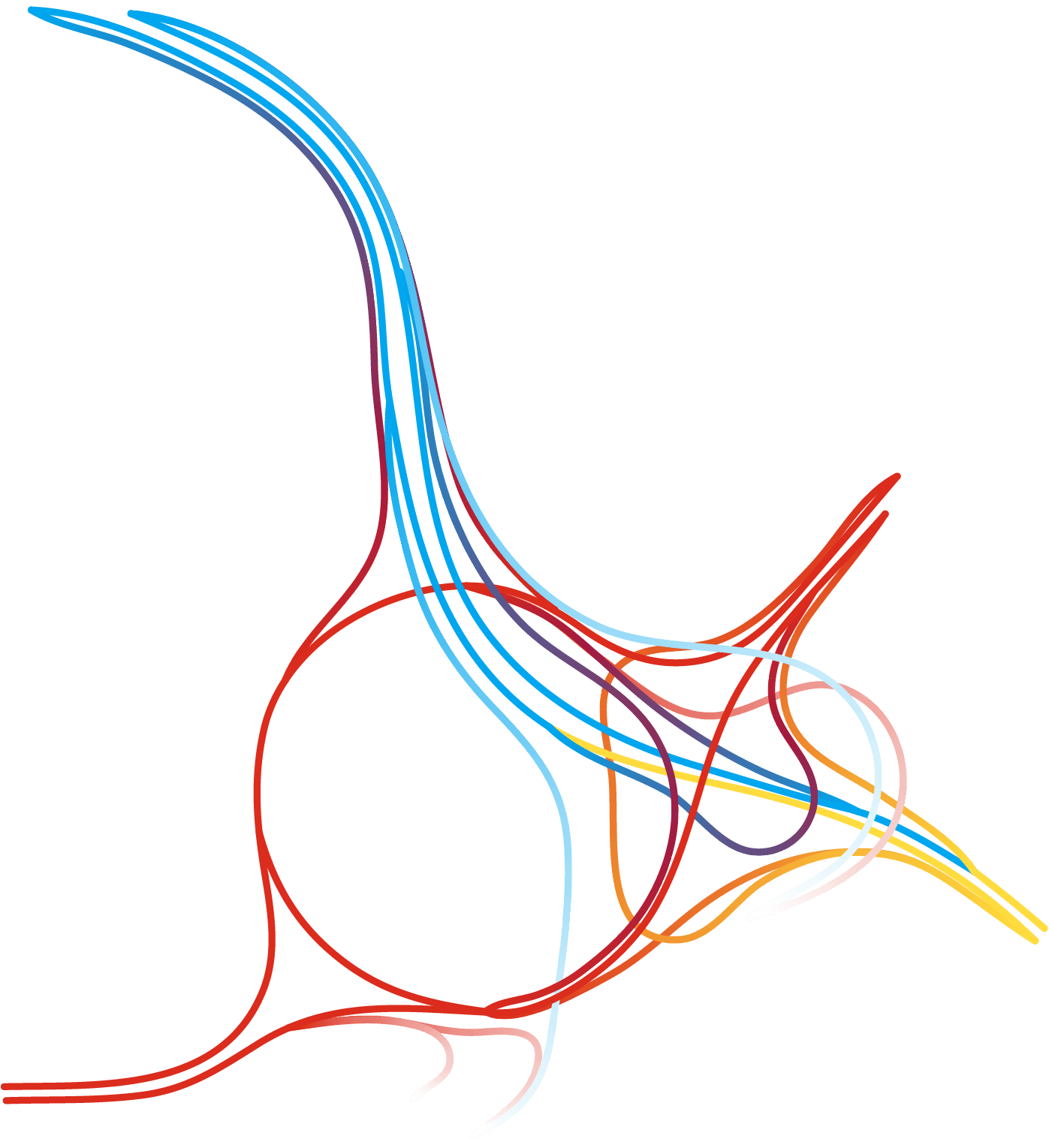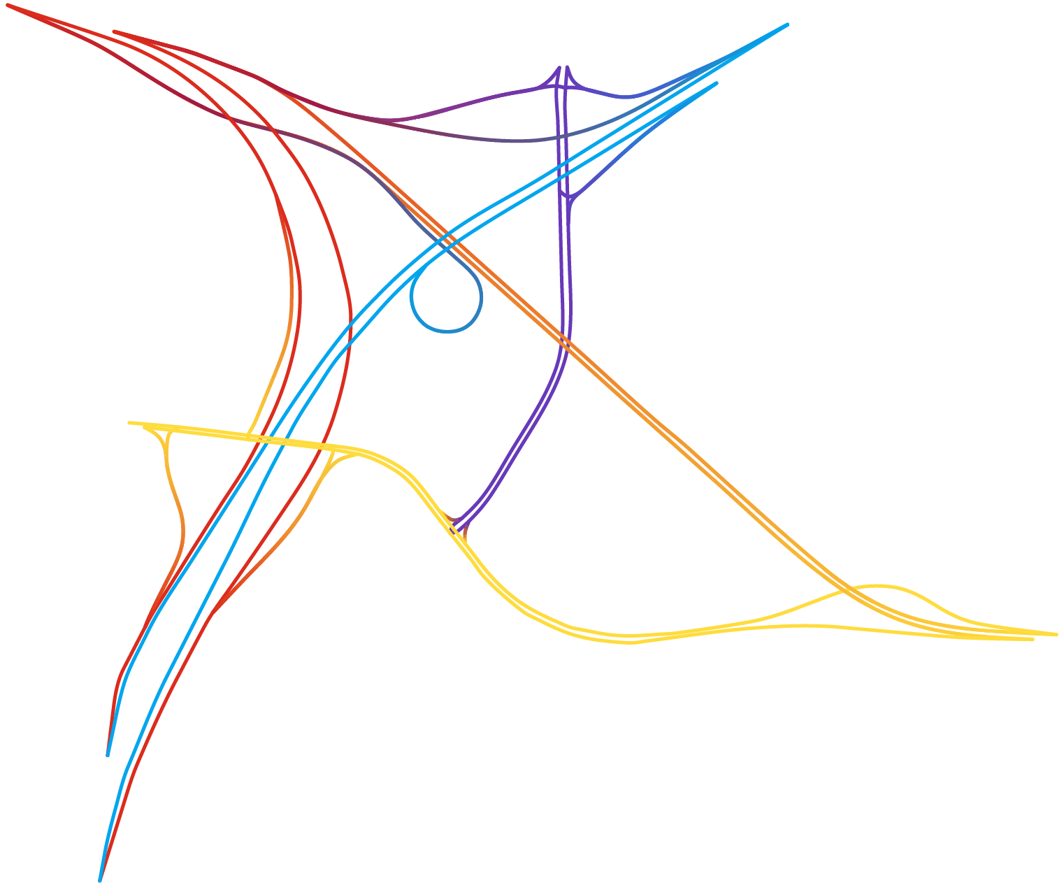 Partout dans le monde les échangeurs autoroutiers se sont vus affublés d’étranges surnoms tels que « bretelles », « nœuds » ou encore « carrefours spaghettis » (« spaghettis junctions » en anglais) évoquant fortement, et à juste titre, un désordre enchevêtré. Le cartographe – graphiste Nicholas Rougeux nous prouve avec brio qu’il est toujours possible de trouver de la beauté dans le chaos.